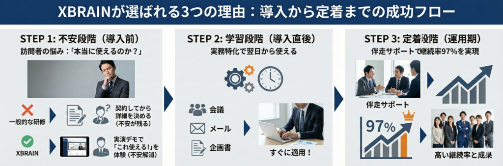 「AIを操作するのは、プログラムコードではなく『言葉』です。だからこそ、35年間『人』と向き合い、心を動かしてきたXBRAINの行動心理学メソッドが、AIのポテンシャルを最大化するのです。」